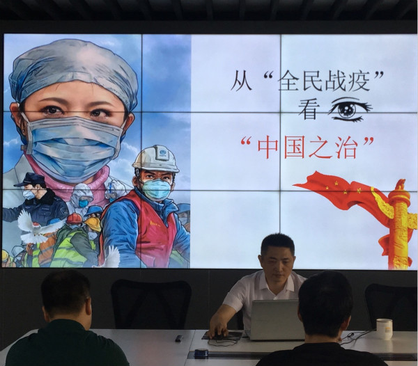 在宣讲中首先通过短视频展示了武汉这座英雄城市的战疫之路,指出全民战役充分彰显了“中国之治”的制度优势。紧接着从四个方面就如何彰显“中国之治”问题进行深入剖析。第一,中国力量,中国精神。全民战疫体现出了中国举世瞩目的动员能力,人民至上、生命至上的宗旨以及文化自信所凸显的强大精神力量。第二,守住底线,适应常态。在战疫中,中国坚守了“底线思维”,并指出要从防控措施、防控管理方式和服务手段、联防联控和安抚人心四个方面做好“防疫常态化”。第三,化危为机,破茧成蝶。疫情带来的不仅是挑战,更是机遇,中国做到了在危机中育新机,于变局中开新局,比如以钉钉、腾讯会议、学习通等教学软件为载体的在线教育迅速普及。第四,大国担当,携手抗疫。中国在全球战疫中展现了中国担当,包括内防扩散、外防输出,开展国际合作以及投木报琼、交流互鉴。