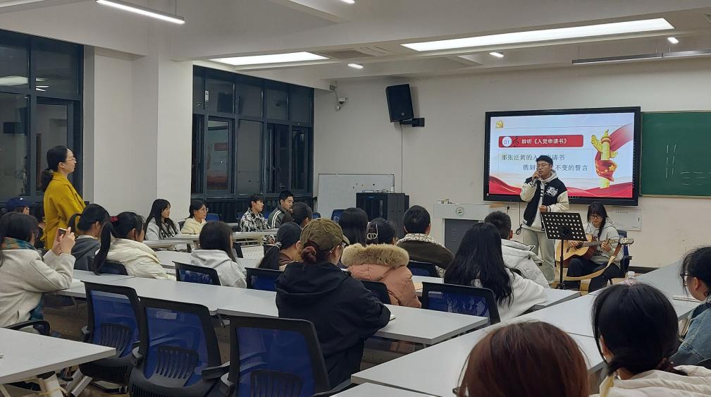 活动从歌曲《入党申请书》开始,伴随吉他弹唱,同学们随即被引入了深深思考。紧接着马克思主义学院党总支书记秦丹向大家介绍了《中国共产党章程》中关于入党的规定和要求。然后同学们向老党员学习,一起探索师兄师姐、思政教师雷焦焦以及党的好干部焦裕禄等人“为什么要加入中国共产党”,同学们聆听、讨论、思考,逐渐有所感悟。