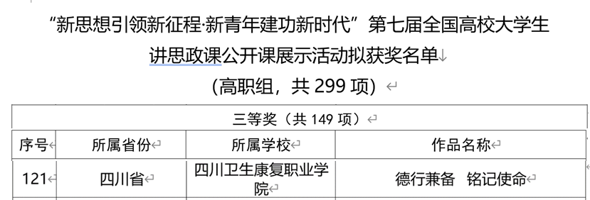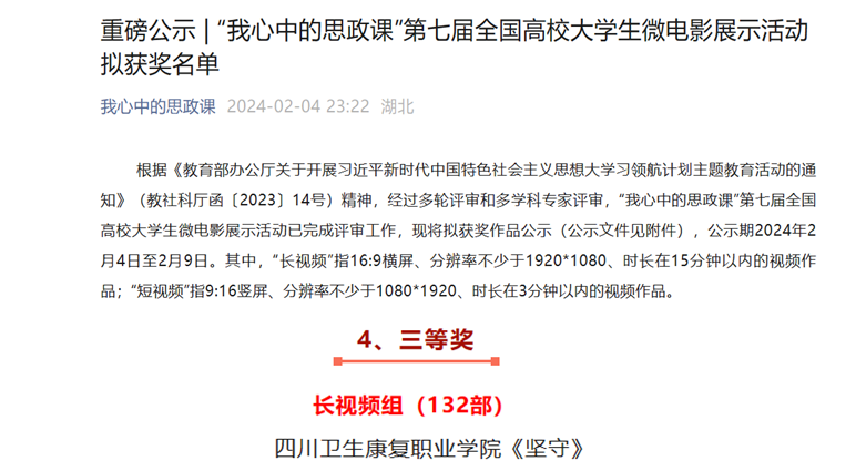 近日,教育部高校思政课教学指导委员会公布了“我心中的思政课”第七届全国高校大学生微电影展示活动和第七届全国高校大学生讲思政课公开课展示活动的获奖作品,开元官网再创佳绩有2件作品获奖,其中作品《坚守》获“我心中的思政课大学生微电影展示长视频组三等奖,作品《德行兼备 铭记使命》获大学生讲思政课展示高职组三等奖。