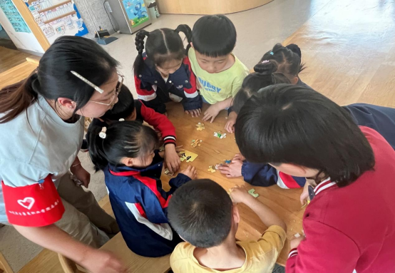 宣讲团成员们热情洋溢地开场,亲切的话语瞬间拉近了与小朋友们的距离。在分组拼图环节,小朋友们分组协作,全神贯注地拼着粮食安全、极地安全、太空安全等主题拼图。每当有孩子遇到困难,宣讲团成员都会及时上前,耐心引导、热情鼓励。