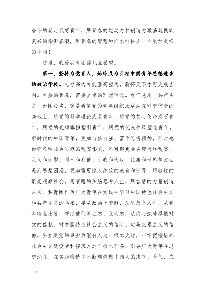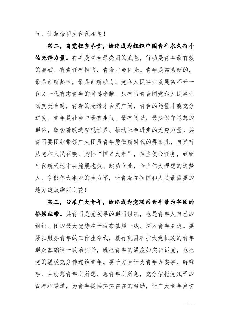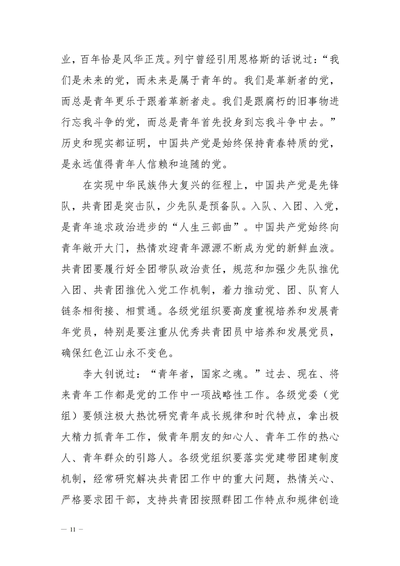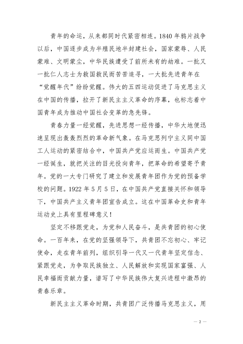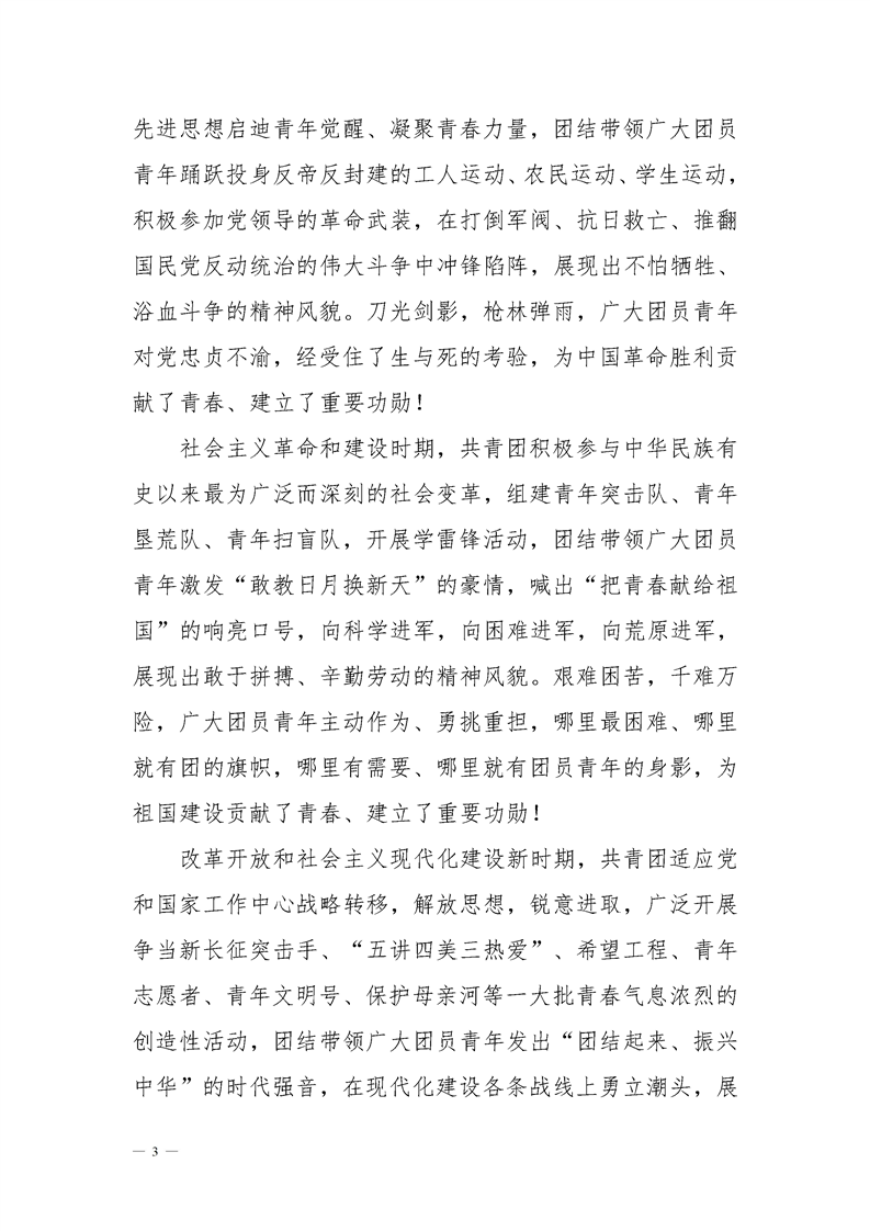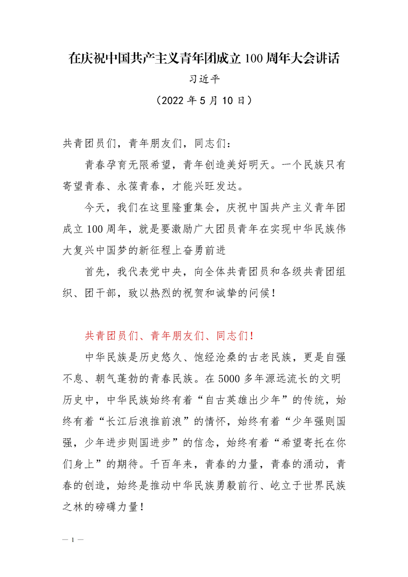 习近平在庆祝中国共产主义青年团成立100 周年大会上的讲话