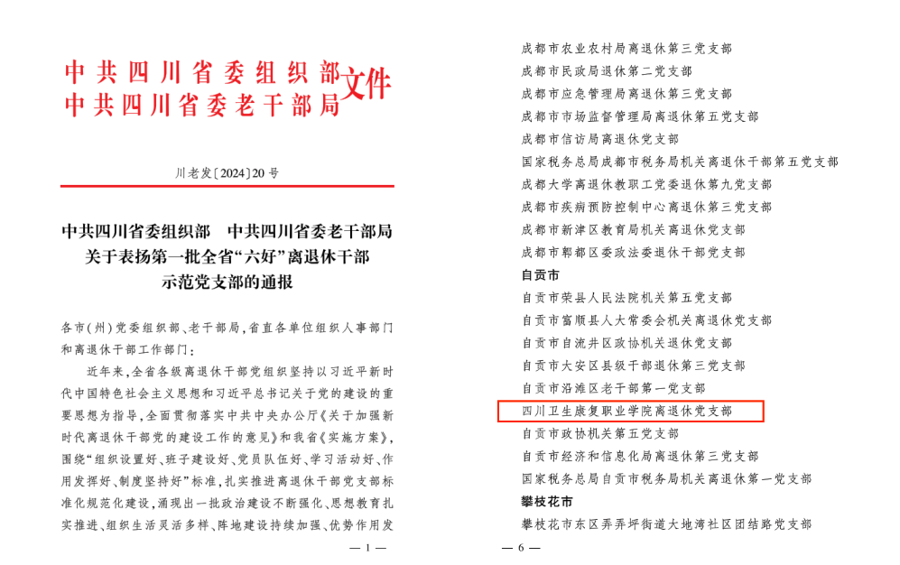 近日,中共自贡市委组织部中共自贡市委老干部局印发《关于通报表扬第一批自贡市“六好”离退休干部示范党支部的通知》,中共四川省委组织部中共四川省委老干部局印发《关于表扬第一批全省“六好”离退休干部示范党支部的通报》,开元官网离退休党支部获此殊荣。