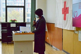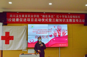 市红会朱海宁主任致辞,对学校项目的实施提出要求,作为医学院校应提升项目质量,希望不断加强红十字救护工作建设,不断提升红十字工作能力,圆满完成项目计划。校团委副书记王庆对市红会一直以来的支持表示感谢,表示将继续深化与市红会合作和共建,努力提升学校红十字工作成效。校团委唐彬老师就“救在身边”红十字助力疫情防控学校健康促进项目作了介绍,指出项目将持续一个月组织实施开展,围绕“四维七度”深入服务师生。仪式上,市红会向学校授项目旗和项目牌,项目代表、校青协唐瑜同学率全体志愿者庄严宣誓,誓争全力做好项目。