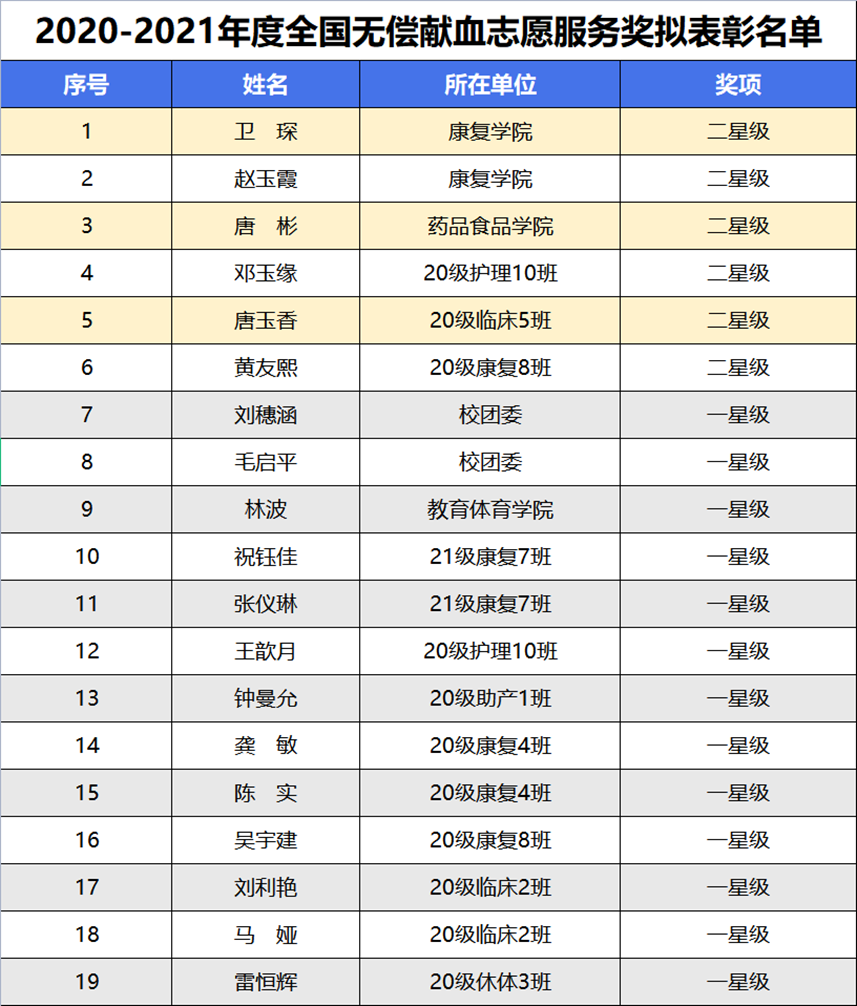 在全国无偿献血奉献奖的702,370人中,开元官网有6名教师,13名同学共计19人榜上有名。其中,荣获“二星级”的师生共6人 ,现将名单公布如下: