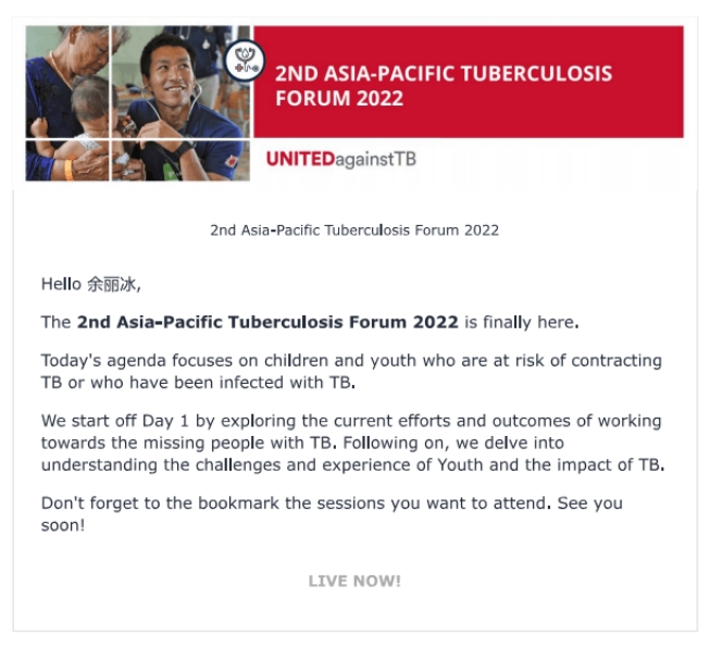 此次年度论坛的目的是希望为亚太地区致力于消除结核病的相关各方搭建平台,将政策制定者、专家、青年领袖、非营利机构、智库和学者聚集在一起,分享、合作、构思和拓展各类项目和倡议,以缩小不同区域间的差距,推动患者的发现工作,并聚焦于青年群体,青年家长群体(针对儿童结核病防治)和潜在的青年影响力倡导者。致力于推动患者的发现工作,并聚焦青年群体、青年家长群体(针对儿童结核病防治)和潜在的青年影响力倡导者,推动实现到2030年消除结核病的联合国可持续发展目标。