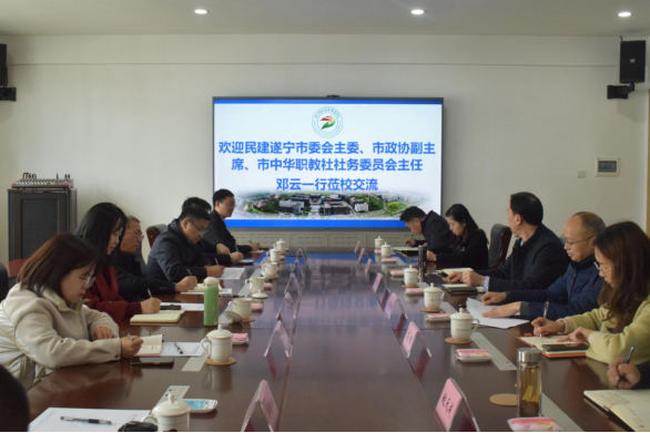 3月4日,民建遂宁市委会主委、市政协副主席、市中华职教社社务委员会主任邓云一行来校考察交流,自贡市委统战部副部长、市侨办主任唐光权,学校党委副书记、校长黄昌平陪同。邓云一行先后到教育体育学院产教融合基地、学生服务与发展中心考察产教融合及民族学生管理等情况,随后在会议室进行了座谈交流。