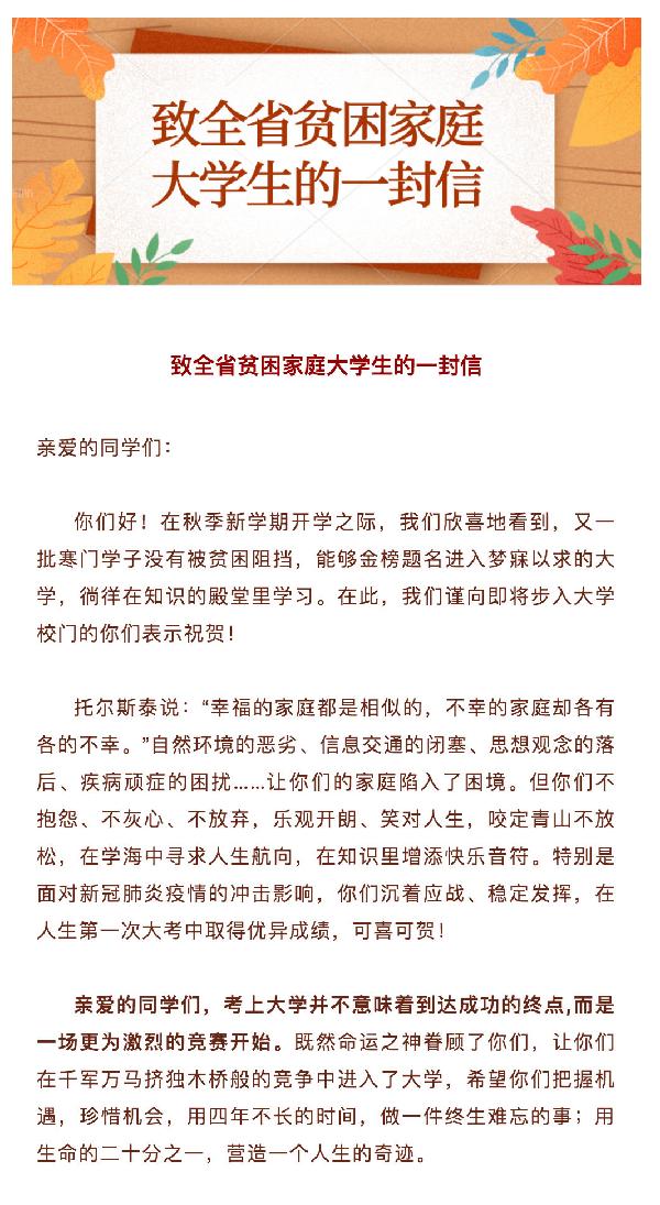 教育厅致信贫困家庭大学生:艰难困苦,玉汝于成!附我省最新本专科学生资助政策