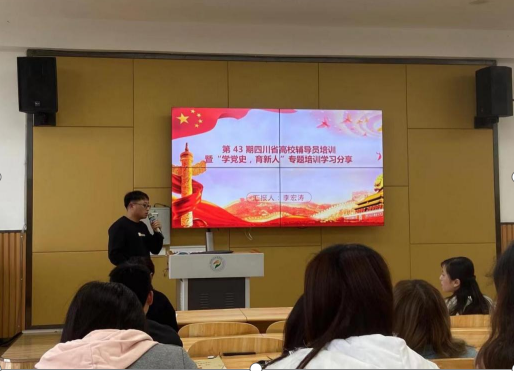会上李宏涛老师对参加省教育厅举办的“学党史,育新人”的党史教育专题培训进行了分享,他通过参与公祭革命烈士,参观“飞夺泸定桥”纪念馆、重走红军长征路等实践教育谈了自身的感受。通过此次党史学习经验分享,也使在座的每一位辅导员深刻认识到作为新时代人民教师,要认真学习党史、国史,知史爱党,知史爱国。