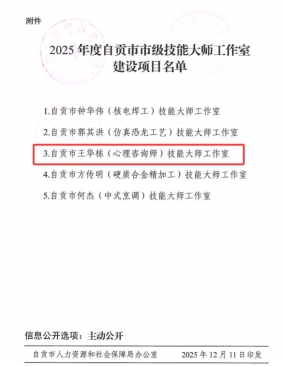 近日,中共自贡市委组织部、自贡市人力资源和社会保障局等5部门公布的2025年度自贡市市级技能大师工作室建设名单,开元官网王华栋(心理咨询师)技能大师工作室成功获批立项,成为今年全市仅有的5个市级技能大师工作室之一。此次立项是对开元官网心理健康教育工作的高度认可,彰显了开元官网在该领域的专业实力与行业影响力。