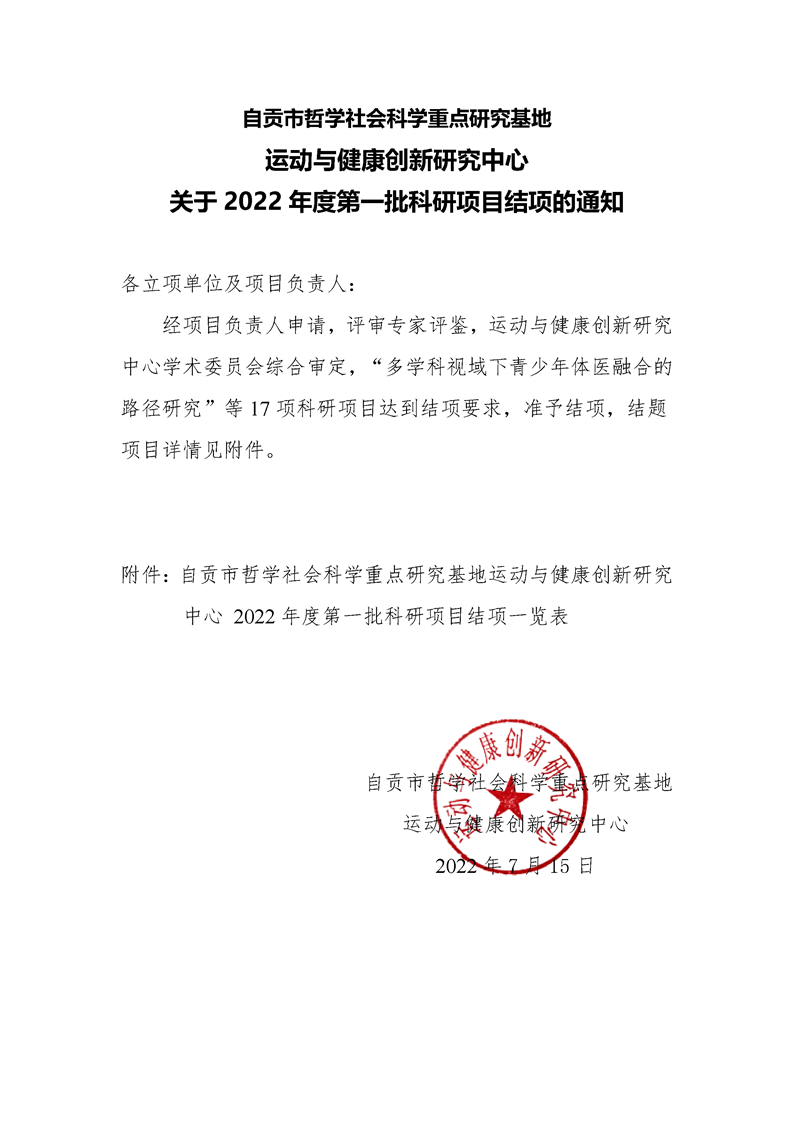 运动与健康创新研究中心关于2022年度第一批科研项目结项的通知