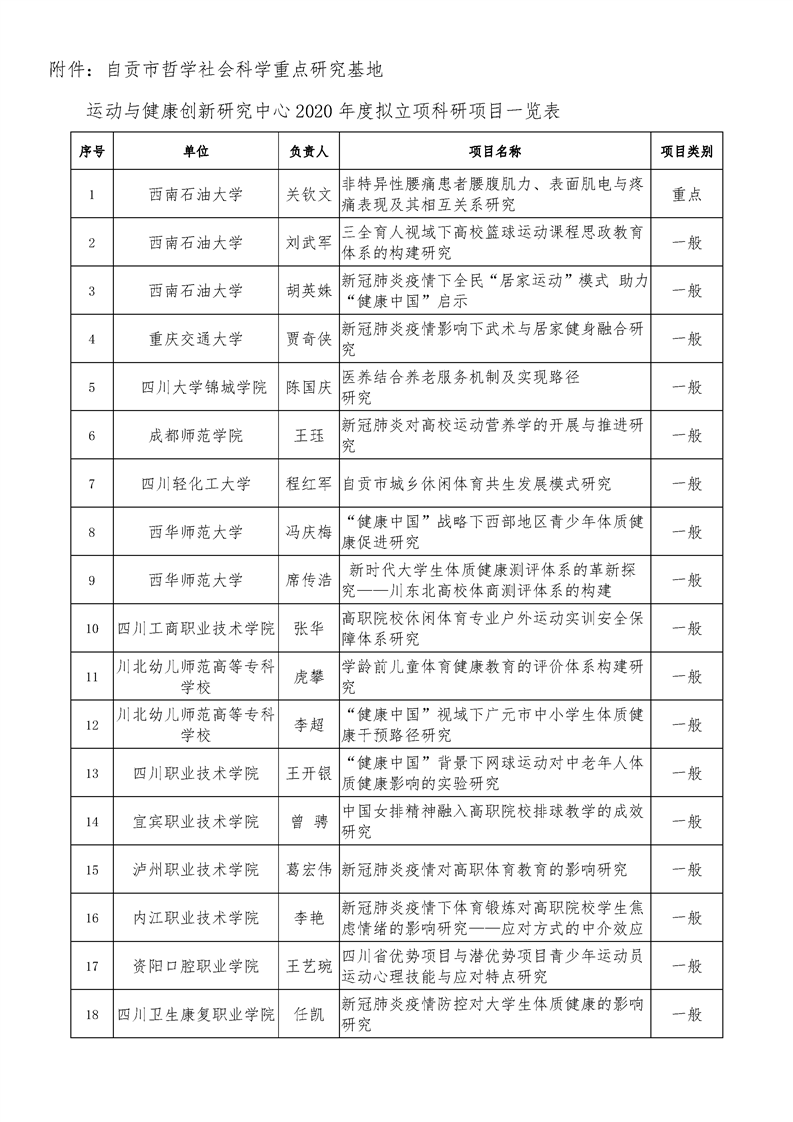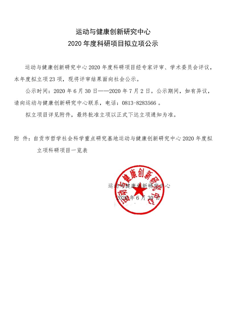 运动与健康创新研究中心 2020年度科研项目拟立项公示