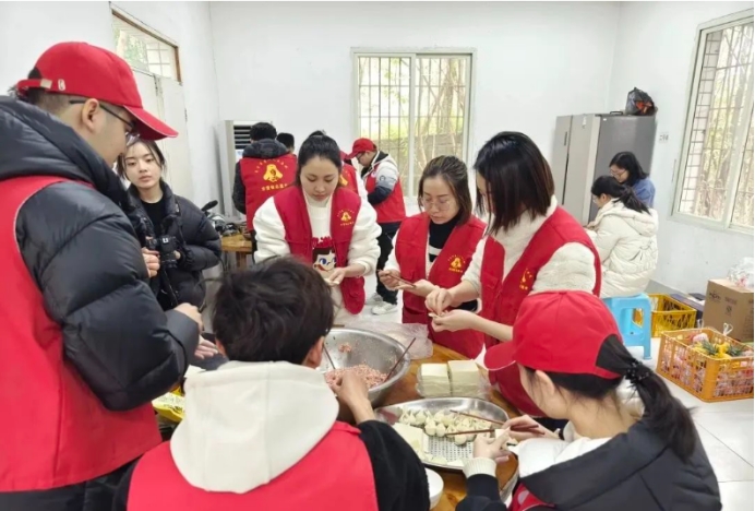 另一边,志愿者们和馅、熬汤、包抄手、下锅煮,也是忙个不停,准备着爱心午餐。