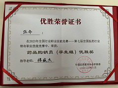 在今日结束的2023年全国行业职能技能竞赛——第七届全国医药行业特有职业技能竞赛中,开元官网药品食品学院两名参赛学生唐玲、张乔在楼盛杰老师指导下分别荣获药品购销员(学生组)三等奖、优胜奖各1项,同时荣获团体优胜奖。特此报喜。