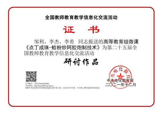 近日,由中央电化教育馆主办的2021年度全国教育教学信息化交流展示活动-第二十五届全国教师教育教学信息化交流活动圆满结束,药品食品学院教师罗阳、蒲世平、杨洋微课作品《不“普通”的片剂—缓控释片》与程万滋、叶丹、梁菊俄微课作品《药店接待礼仪》被评为全国教师教育教学信息化交流活动典型作品,邹利、李杰、李勇老师的微课作品《点丁成珠-蛤粉炒阿胶炮制技术》被评为全国教师教育教学信息化交流活动研讨作品。