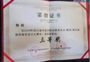 近年来,药学系教师先后获得各种奖项28项(国家级12项),包括:“全国十佳青年临床药师”1项、“天府万人计划”1项,2013、2015年自贡市说课比赛二等奖、一等奖,2014年获“凤凰创壹杯”全国职业院校信息化教学大赛三等奖,2015年获全国中等职业学校医药卫生类专业“创新杯”教师信息化教学设计和说课大赛一等奖,2017年获全国食品药品职业教育药学类专业云课堂比赛三等奖,2018获年四川省中医药教育协会高职组说课比赛一等奖,自贡市人民政府教学成果奖二等奖,2019年获全国食品药品职业教育微课比赛二等奖1项、三等奖2项,获全国临床创新与发明大赛三等奖1项。2020年获全省职业院校教师教学能力大赛二三等奖各1项,获四川省中医药职业教育协会教学设计比赛三等奖1项,获全国临床创新与发明大赛三等奖1项。2021年荣获“黄炎培职业教育杰出教师奖”1项、“四川省卫生健康系统先进个人”1项、首届全国教材建设先进个人四川省推荐提名1项等。