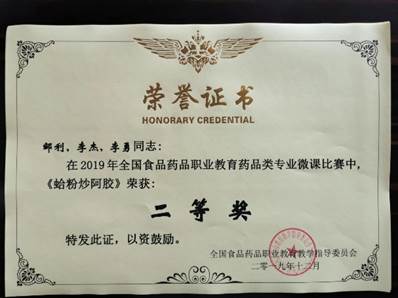近年来,药学系教师先后获得各种奖项28项(国家级12项),其中获得2013、2015年自贡市说课比赛二等奖、一等奖,2014年“凤凰创壹杯”全国职业院校信息化教学大赛三等奖,2015年全国中等职业学校医药卫生类专业“创新杯”教师信息化教学设计和说课大赛一等奖,2017年全国食品药品职业教育药学类专业云课堂比赛三等奖,2018年四川省中医药教育协会高职组说课比赛一等奖,2018年自贡市人民政府教学成果奖二等奖等,2019年获全国食品药品职业教育微课比赛二等奖1项、三等奖2项,全国临床创新与发明大赛三等奖1项。
