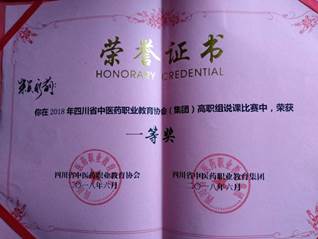 近年来,药学系教师先后获得各种奖项28项(国家级12项),其中获得2013、2015年自贡市说课比赛二等奖、一等奖,2014年“凤凰创壹杯”全国职业院校信息化教学大赛三等奖,2015年全国中等职业学校医药卫生类专业“创新杯”教师信息化教学设计和说课大赛一等奖,2017年全国食品药品职业教育药学类专业云课堂比赛三等奖,2018年四川省中医药教育协会高职组说课比赛一等奖,2018年自贡市人民政府教学成果奖二等奖等,2019年获全国食品药品职业教育微课比赛二等奖1项、三等奖2项,全国临床创新与发明大赛三等奖1项。