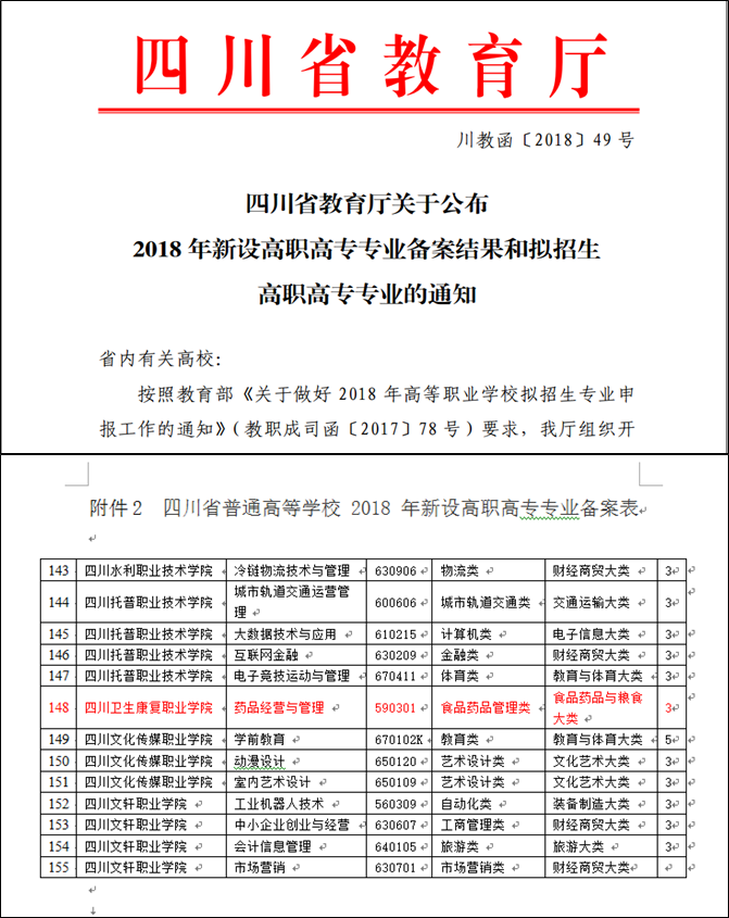 根据四川省教育厅《关于公布2018年新设高职高专专业备案结果和拟招生高职高专专业的通知》(川教函〔2018〕49号)文件精神,开元官网申报的“药品经营与管理”专业正式被登记备案,标志着药学系又一新专业“药品经营与管理”成功申报,可以进行今年的首届招生。