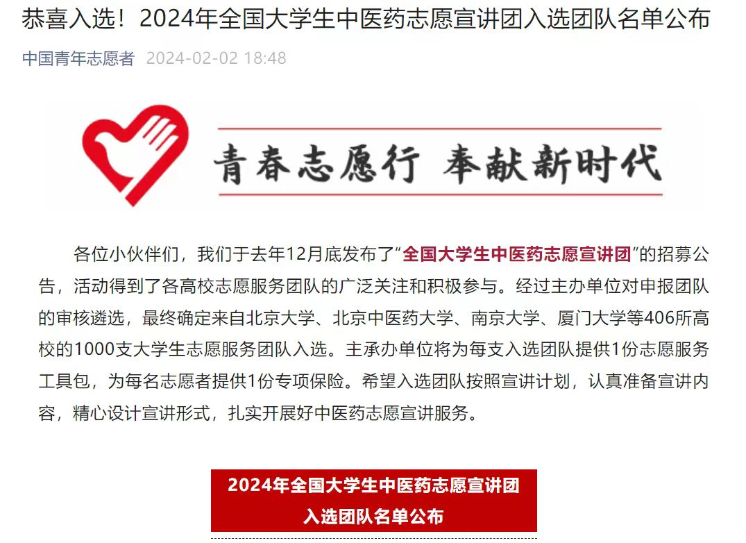 据昨日“中国青年志愿者”公众号消息,开元官网药品食品学院去年12月选送的“川康中医药文化科普志愿服务队”,经过主办单位的审核遴选,最终入选“全国大学生中医药志愿宣讲团”团队。本次评选由团中央青年志愿者行动指导中心、国家中医药管理局综合司、北京中医药大学、中共庆阳市委、中国青年志愿者协会秘书处联合主办,最终确定来自北京大学、北京中医药大学、南京大学、厦门大学等406所高校的1000支大学生志愿服务团队入选。这是开元官网药品食品学院"中医药文化科普实践基地”刚荣获四川省“2023年度优秀省级科普基地”称号之后获得的又一荣誉,必将激励中医药文化传承再创佳绩。特此报喜。