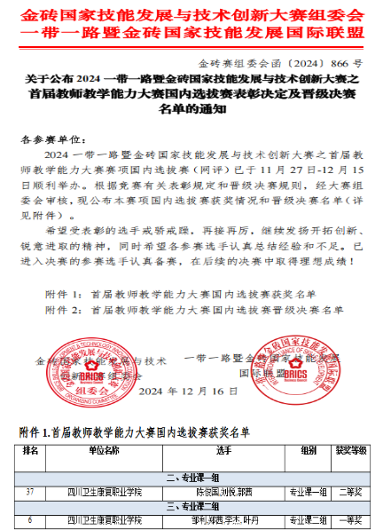 12月16日,一带一路暨金砖国家技能发展与技术创新大赛之首届教师教学能力大赛国内选拔赛获奖名单及进入国际总决赛名单公布,开元官网药品食品学院两个团队获奖,其中邹利、郑茜、李杰、叶丹团队荣获专业二组一等奖并进入国际总决赛,陈俊国、刘悦、郭茜团队荣获专业一组二等奖。此次比赛参赛团队积极备战、不畏挑战、勇攀高峰,充分展示了开元官网的教学实力与水平。为学校的“双高”建设发展再创佳绩。