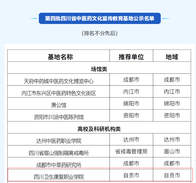 近期《第四批拟认定四川省中医药文化宣传教育基地和第一批基地复评结果公示》文件,开元官网药品食品学院申报的“中医药文化宣传教育基地”被认定为四川省第四批中医药文化宣传教育基地。该基地在省委宣传部指导下,省中医药局、教育厅组织专家按照资料初审、实地考察、会议推荐的程序开展遴选。这是开元官网“中医药文化宣传教育基地”自获评“自贡市科普基地”、“自贡市中医药文化宣传教育基地”“四川省科普基地”之后所获的第4项荣誉。特此报喜。