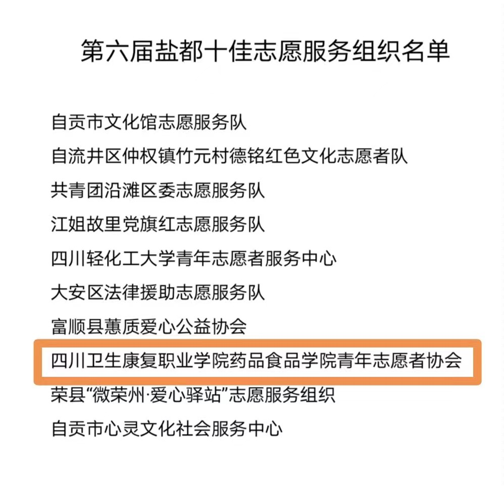 近日,由市文明办、市民政局、市总工会、团市委、市妇联和市志愿服务联合会在全市组织开展的第六届“盐都志愿之星”志愿服务先进典型评选活动中,药品食品学院青年志愿者协会荣获第六届“盐都十佳志愿服务组织”称号。特此报喜。
