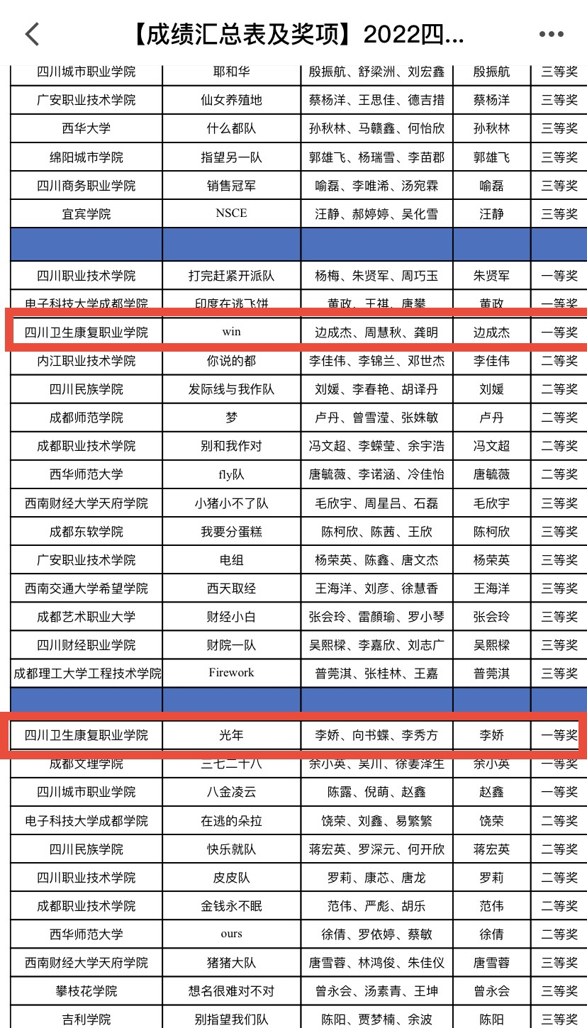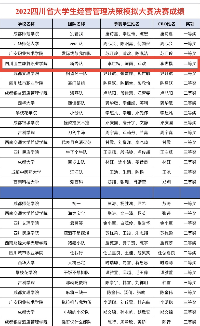 11月5日,在四川省教育厅主办的2022年四川省大学生经营管理决策模拟大赛中,开元官网药品食品学院学生3支队伍进入决赛,与本科、高职高专学生同台竞技,最终斩获一等奖2项,二等奖1项。本次比赛共有全省39所高校128支队伍参赛。特此报喜。