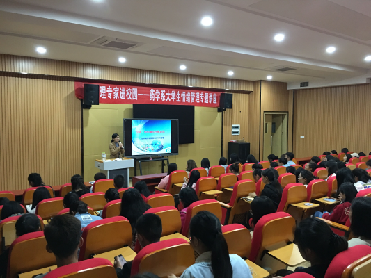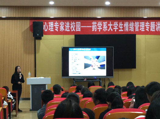 为了让大学生学会自我情绪调节,愉快地学习和生活,药学系于10月17日晚在一教B401报告厅举行了“心理专家进校园——大学生情绪管理专题讲座”。特邀自贡市第一人民医院临床心理科主治医师康芨为在校大学生分享《如何做好自我情绪压力管理》。本次讲座由药学系副主任杨光丽主持。学工干事肖艳老师及药学系一、二年级近200人参加。
