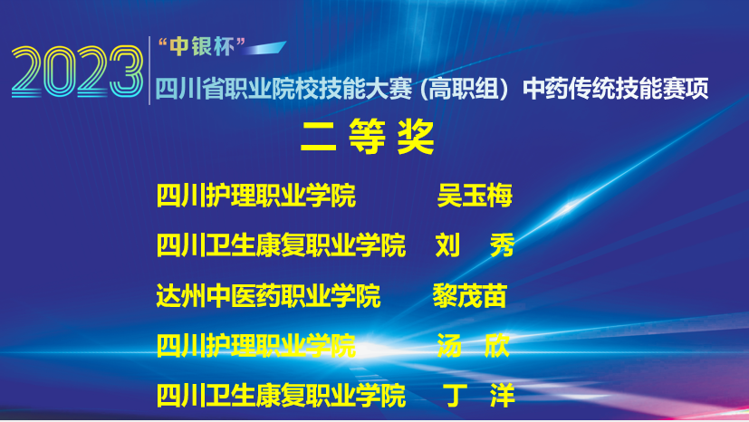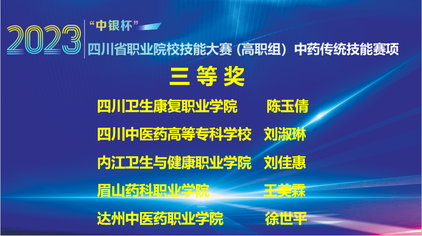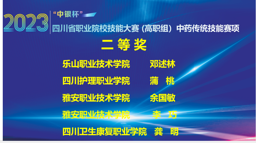 近日,在2023年“中银杯”四川省职业院校技能大赛(高职组)中药传统技能赛项比赛中,经过李勇、廖能、邹利、周礼仕、郑茜、唐敏等老师的悉心指导,开元官网药品食品学院4名中药学专业学生表现突出,全部获奖,荣获3个二等奖,1个三等奖。本次比赛全省共13个学校49名学生参赛。特此报喜。