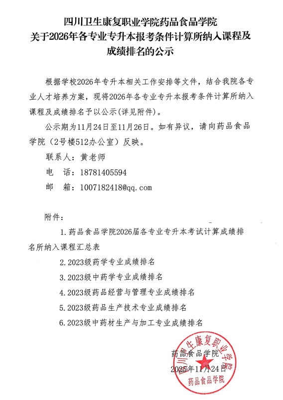 KY开元集团官网药品食品学院关于2026年各专业专升本报考条件计算所纳入课程及成绩排名的公示