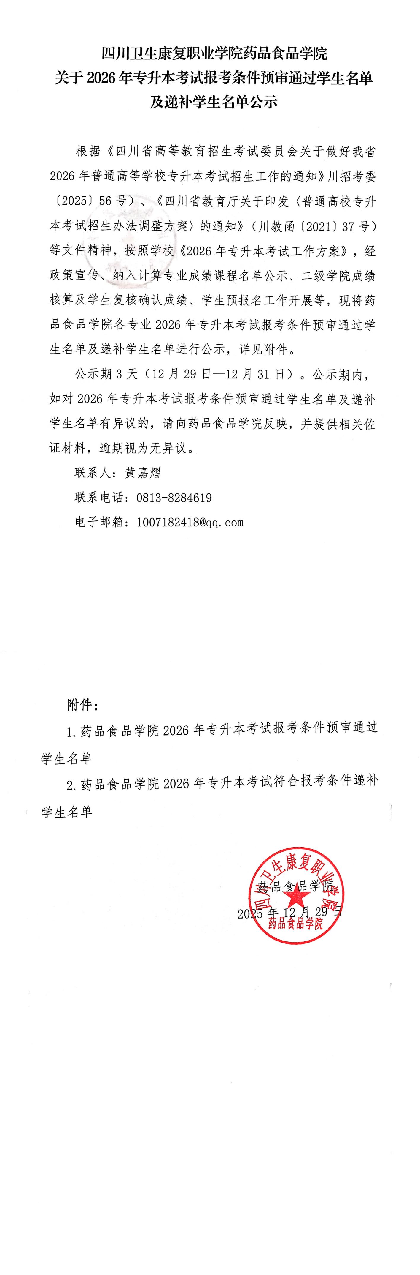 KY开元集团官网药品食品学院关于2026年专升本考试报考条件预审通过学生名单及递补学生名单公示