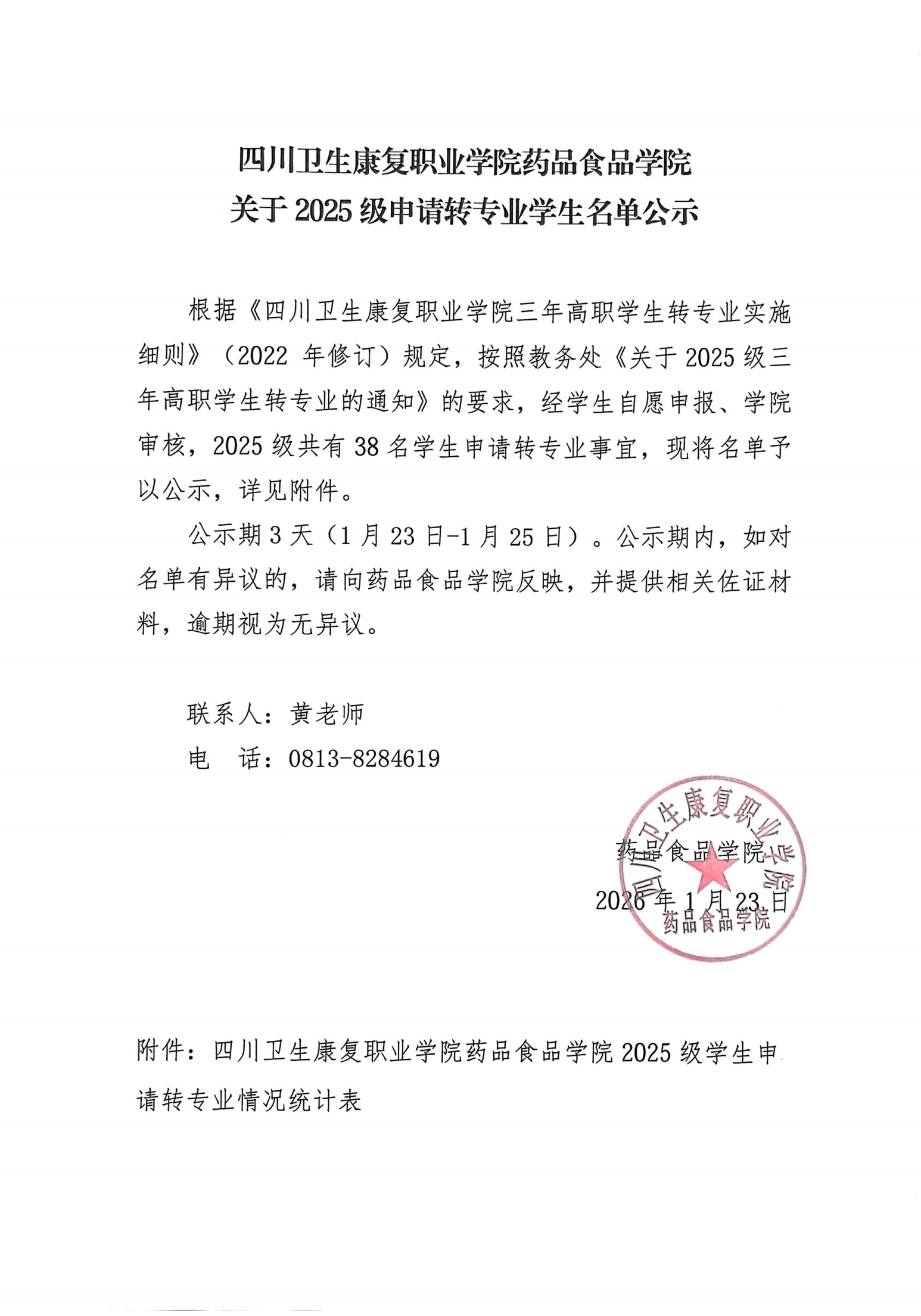 KY开元集团官网药品食品学院关于2025级申请转专业学生名单公示