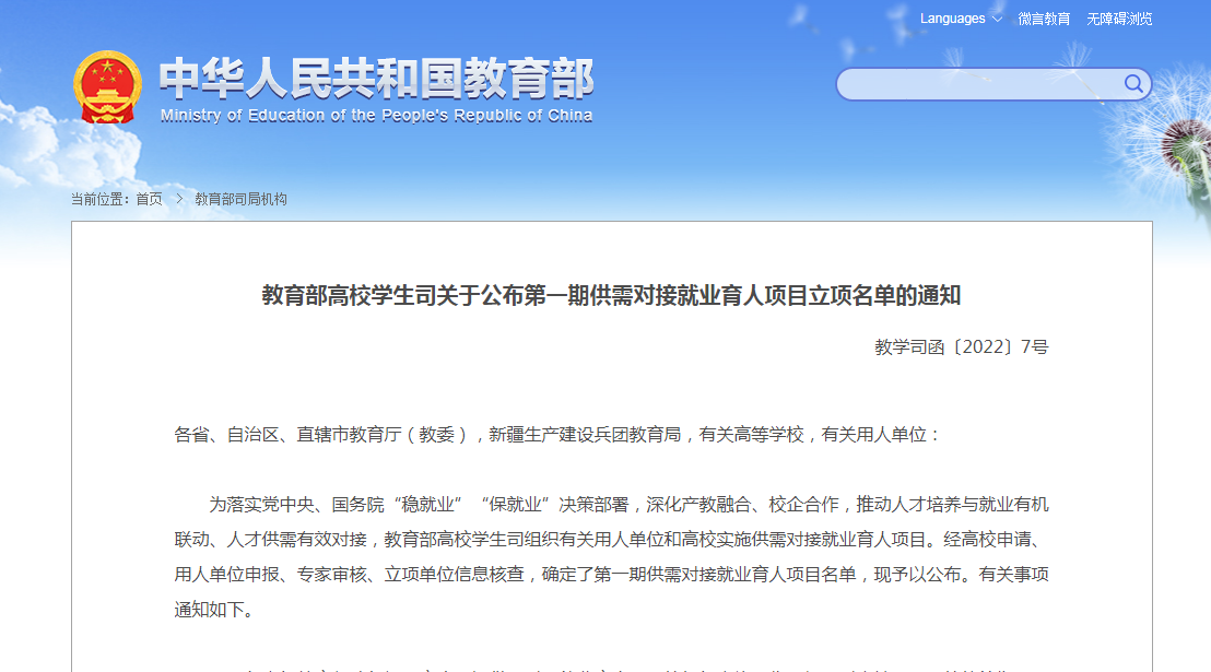 据教育部官网通知《教育部高校学生司关于公布第一期供需对接就业育人项目立项名单的通知》(教学司函〔2022〕7号),开元官网药品食品学院与常州合全药业有限公司联合申报的教育部就业育人项目成功获批立项。