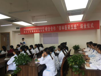 6月14日下午,药学系在2-A514举行了“杏林医药5班”表彰及结业典礼。四川杏林医药连锁有限责任公司营运中心总监罗萍,人力资源部招聘及员工关系经理周鑫,人力资源部招聘主管吴文琴,培训部培训专员、杏林医药5班班主任曾黎,学院副院长黄昌平及药学系师生代表50余人出席了典礼。
