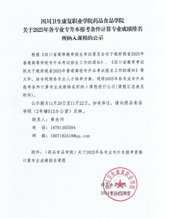 KY开元集团官网药品食品学院关于2025年各专业专升本报考条件计算专业成绩排名所纳入课程的公示