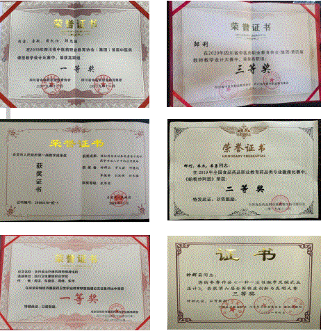 近年来,药品食品学院教师先后获得各种奖项35项(国家级16项),主要包括:“全国十佳青年临床药师”1项,“天府万人计划”1项,“凤凰创壹杯”全国职业院校信息化教学大赛三等奖,全国中等职业学校医药卫生类专业“创新杯”教师信息化教学设计和说课大赛一等奖,全国食品药品职业教育药学类专业云课堂比赛三等奖,四川省教育科研课题阶段成果三等奖1项,四川省中医药教育协会高职组说课比赛一等奖,自贡市人民政府教学成果奖二等奖,全国食品药品职业教育微课比赛二等奖1项、三等奖2项,全国临床创新与发明大赛三等奖3项,四川省职业院校教师教学能力大赛二、三等奖各1项,四川省中医药职业教育协会教学设计比赛三等奖1项,“黄炎培职业教育杰出教师奖”1项,“四川省卫生健康系统先进个人”1项,首届全国教材建设先进个人四川省推荐提名1项,“盐都万人计划优秀科技人才”1项,成渝双城经济圈医药卫生职教联盟首届论文征集评比一等奖2项、二等奖1项等。