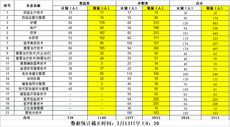 为方便了解开元官网2023年高职单招招生专业报名情况,现将截至2023年3月13日8:30时的各专业填报情况公布如下,供考生填报时参考。