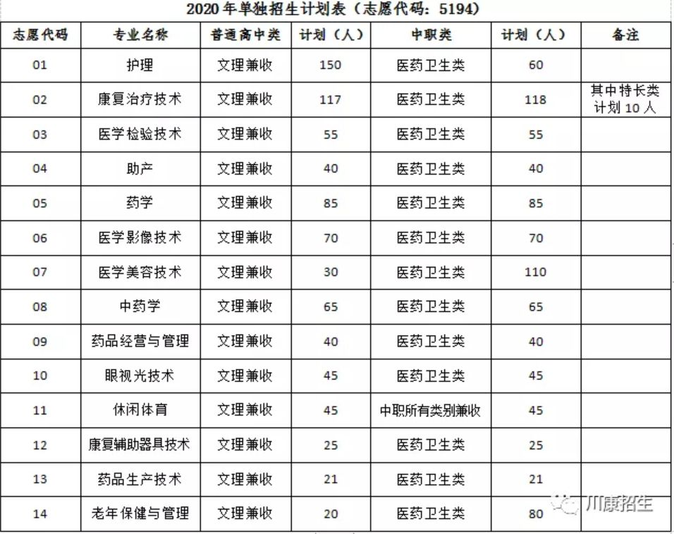 答:有护理、康复治疗技术、医学检验技术、助产、药学、医学影像技术、医学美容技术、中药学、药品经营与管理、眼视光技术、休闲体育、康复辅助器具技术、药品生产技术、老年保健与管理共十四个专业(具体专业计划以四川省教育厅、四川省教育考试院公布为准)。