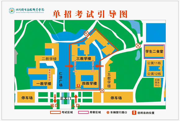 1.因学校单招考试期间进出车辆较多,车流量大,请各自驾车主配合学校保卫部门工作人员,按指定场所有序停放车辆。3月30日9点后,院内部分道路将实施交通管制,考生家长不得进入考试区域(见下图)。